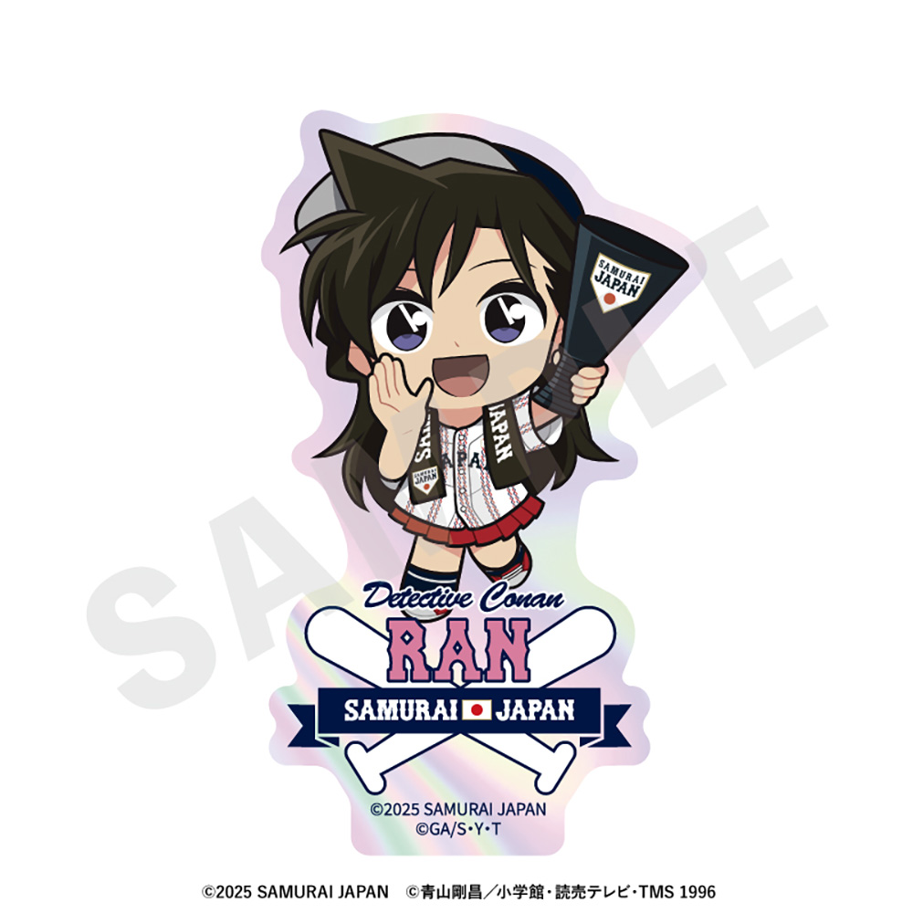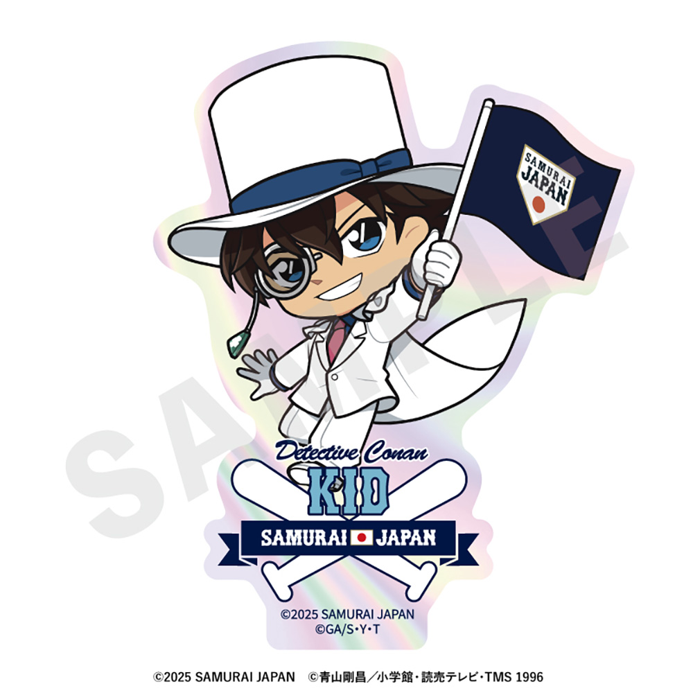 侍ジャパンユニホームを着用したコナンたちの描き起こしミニキャライラストがデザインされた、キラキラのオーロラが目を惹くステッカーです!
